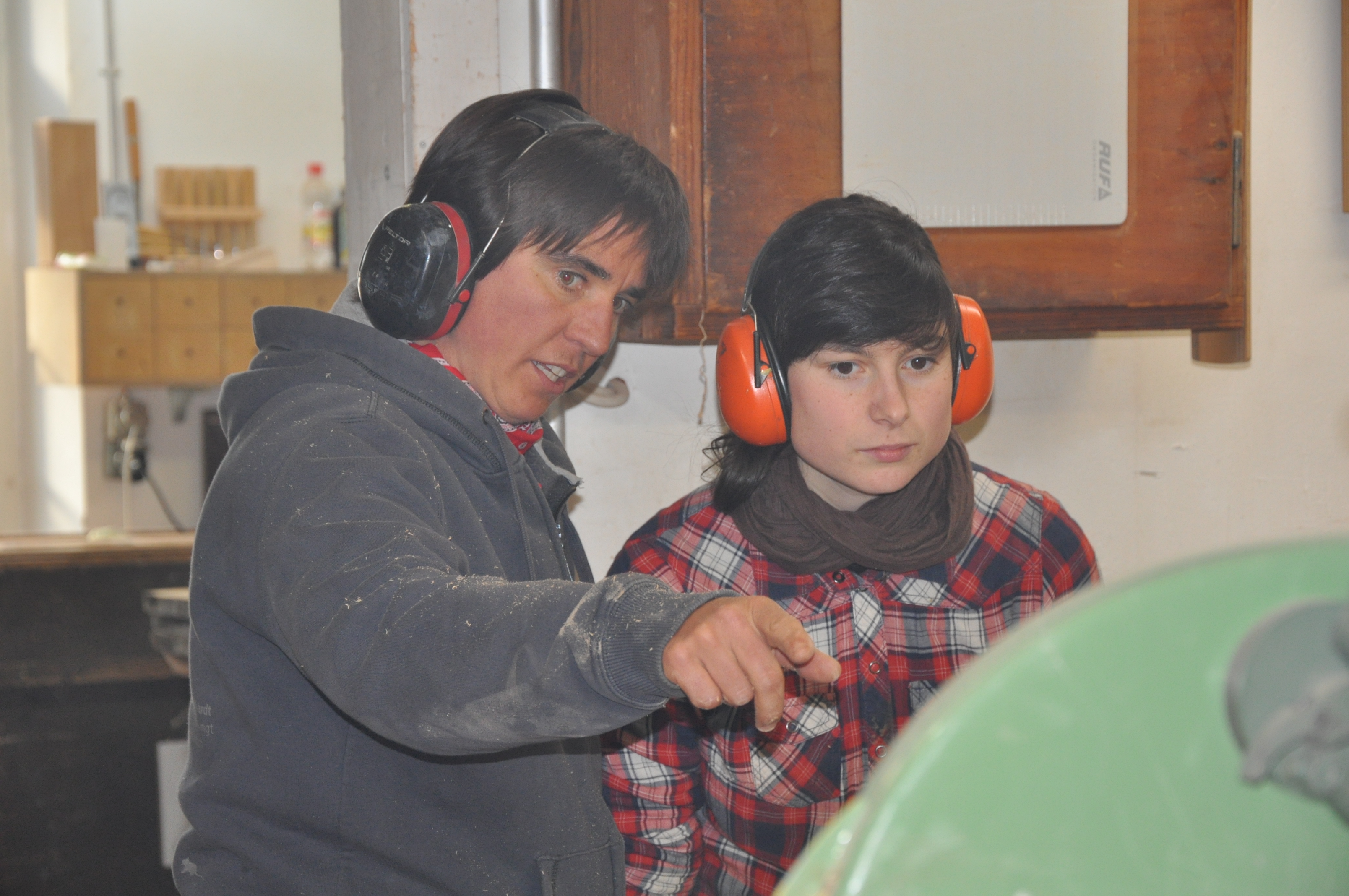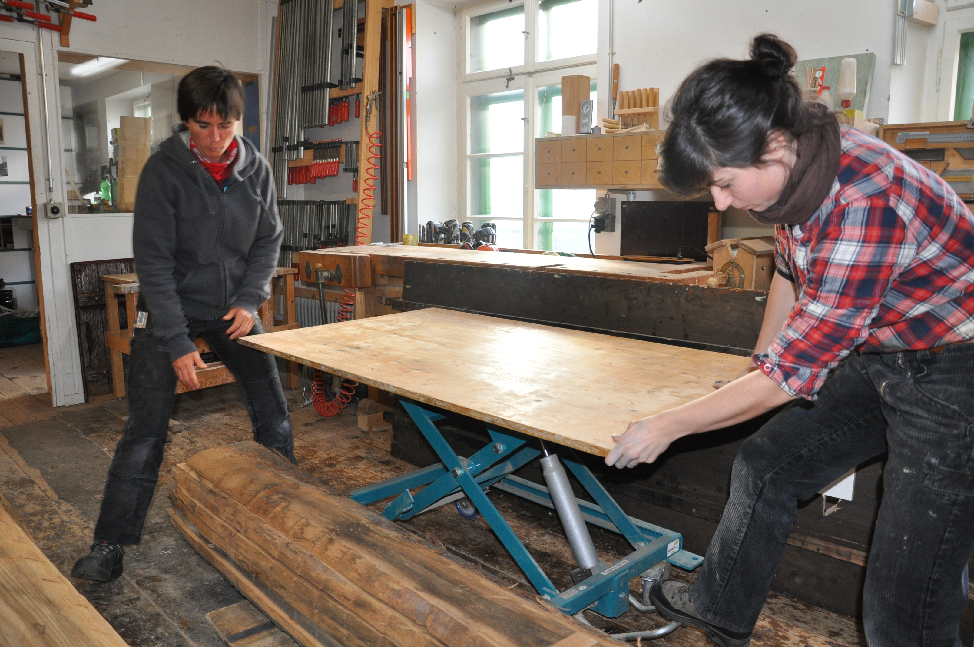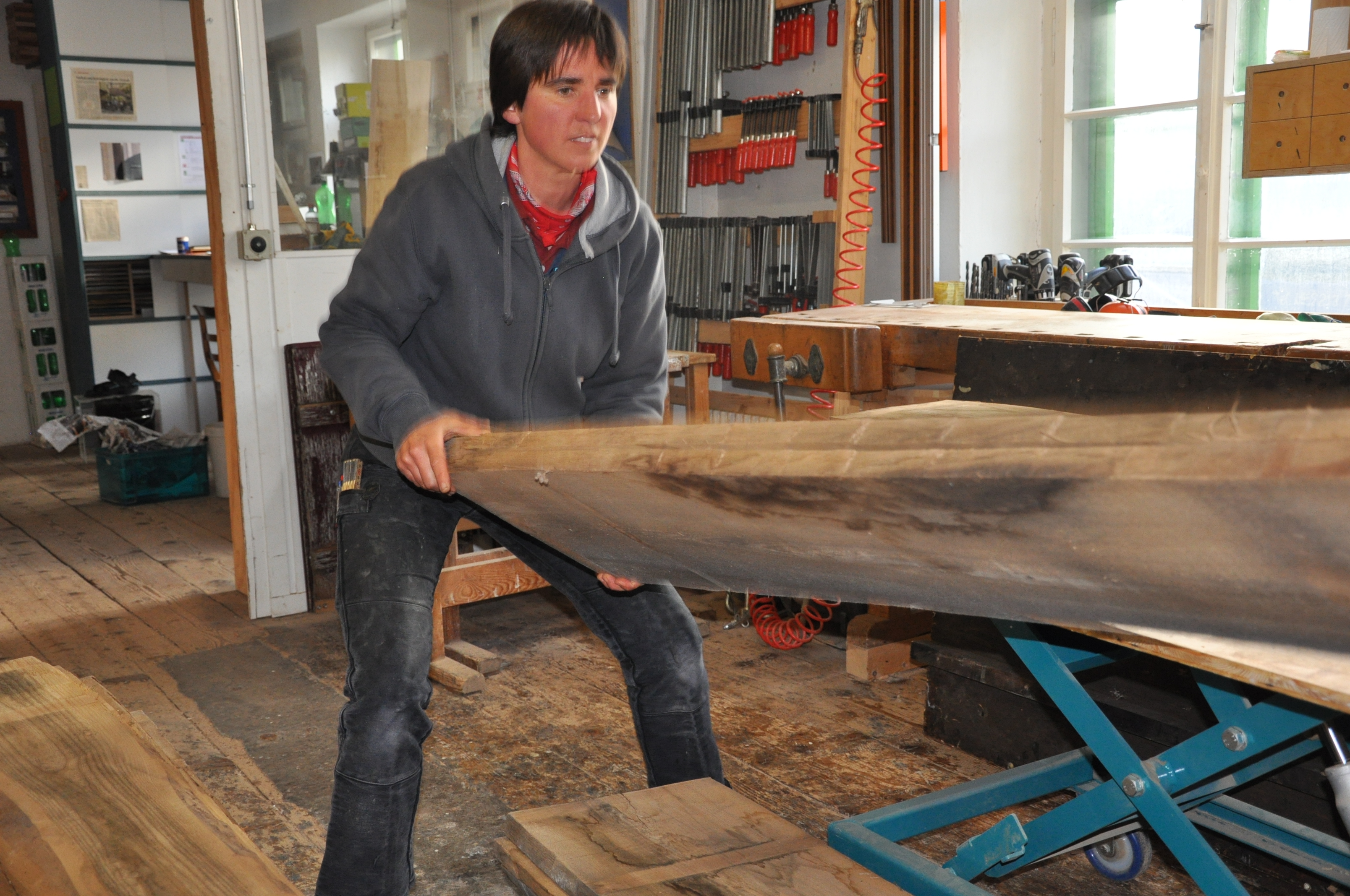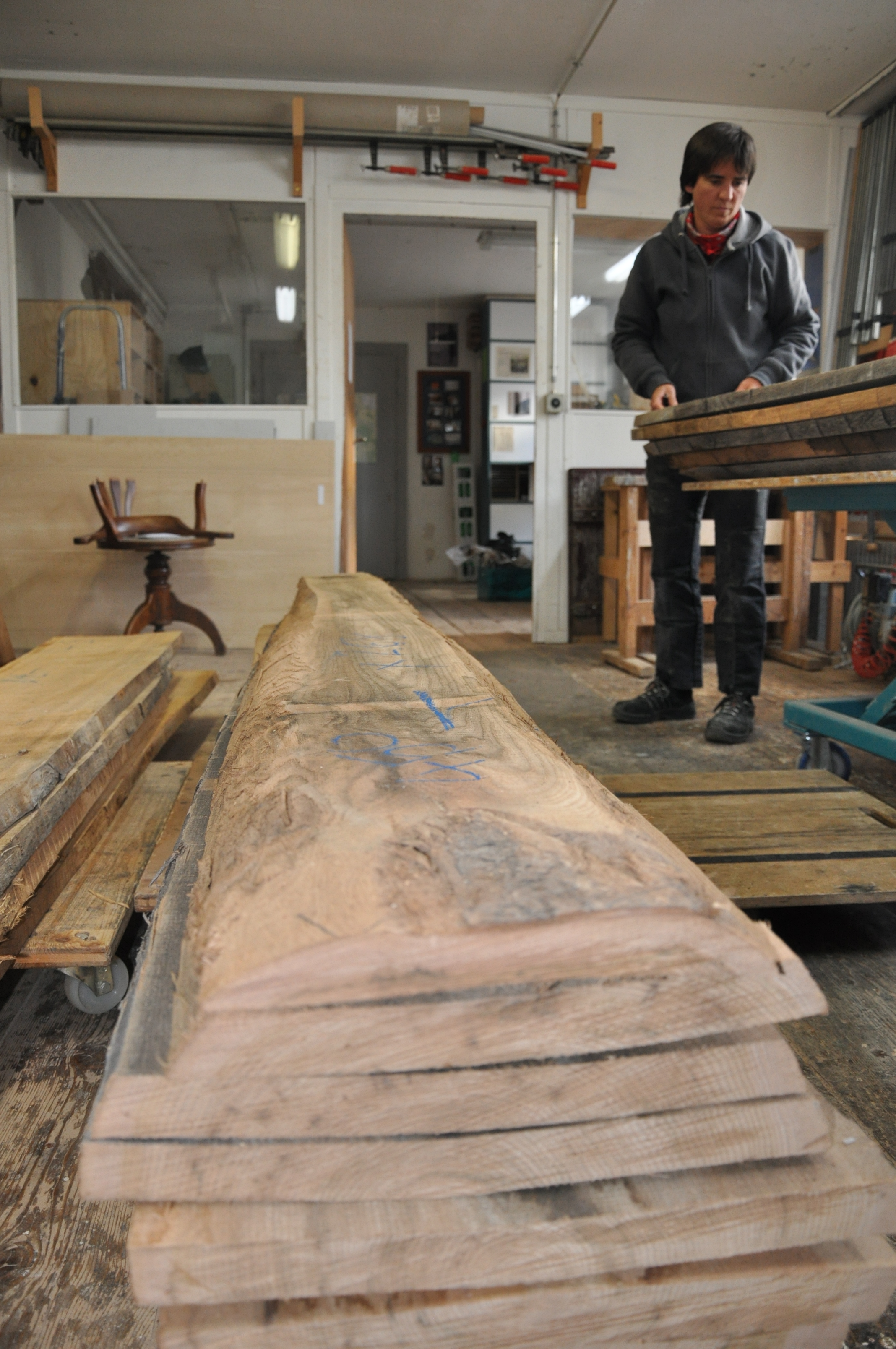 Madeleine steht mit einer Praktikantin vor einem Bretterstapel. In möglichst rückenschonender Haltung platzieren sie die Bretter um. Mehrere hundert Kilogramm schwere Holzstämme werden viele Male umgebettet, bevor sie als Möbelstück die Werkstatt verlassen, erzählt Madeleine. Die Praktikantin, eine gelernte Handarbeitslehrerin, weiss genau, worauf sie sich hier einlässt. Madeleine stellt fest, dass in den letzten Jahren Anfragen junger Erwachsener für ein Praktikum zugenommen haben. In ihrer Winterthurer Werkstatt ist ausserdem eine junge Frau angestellt, die nach der Lehre ein Studium absolviert hat, und nun wieder auf ihrem erlernten Beruf arbeitet.