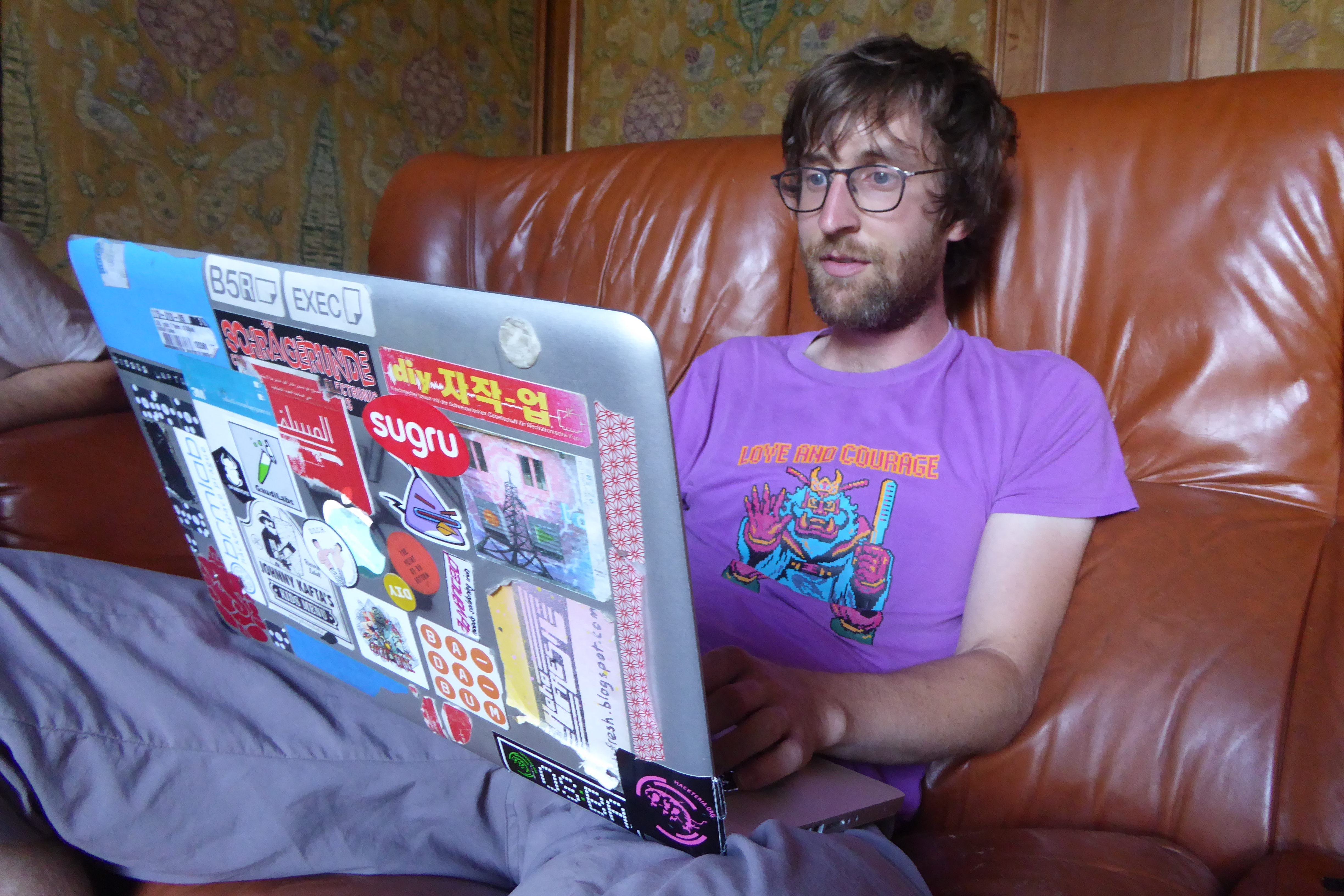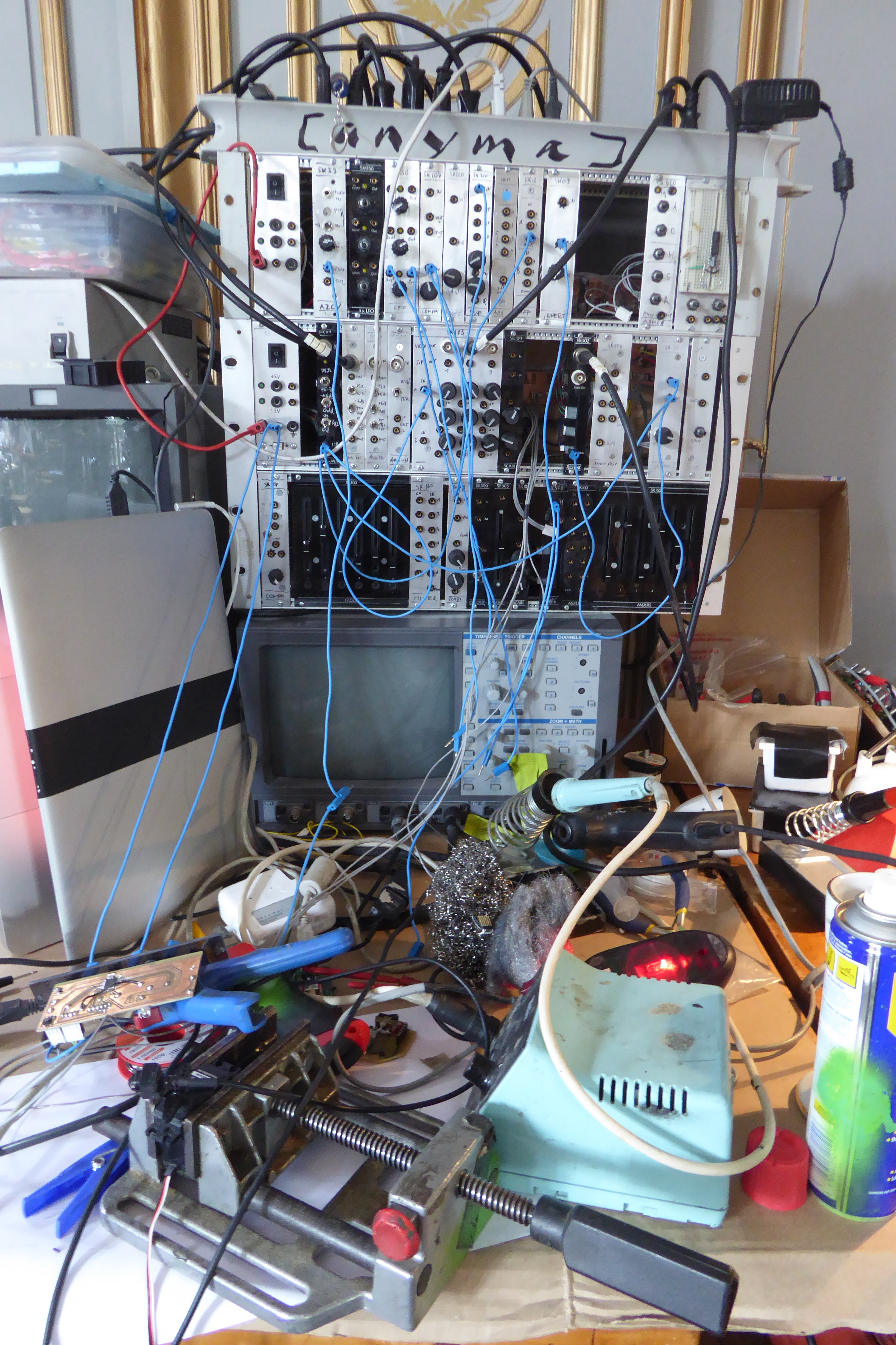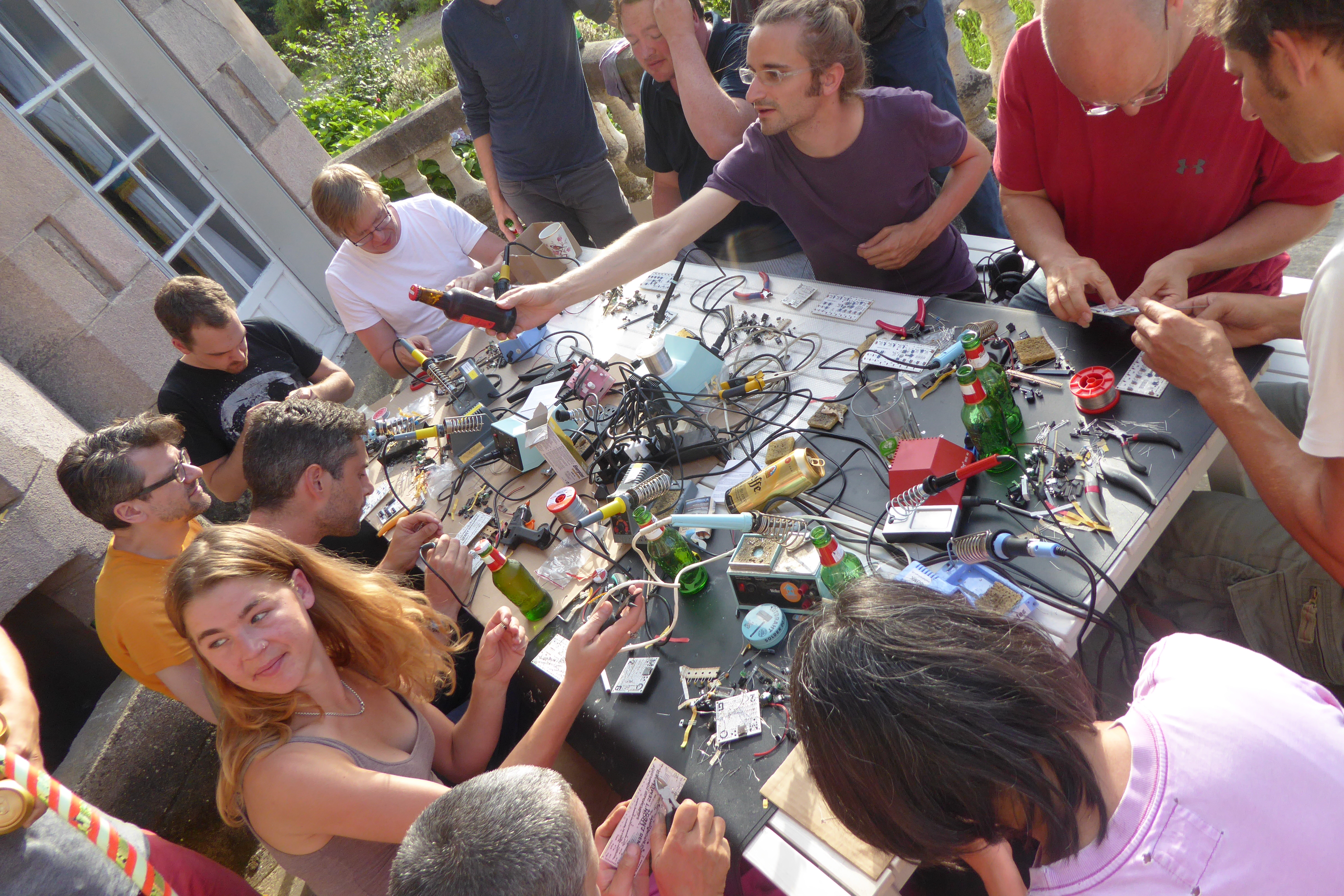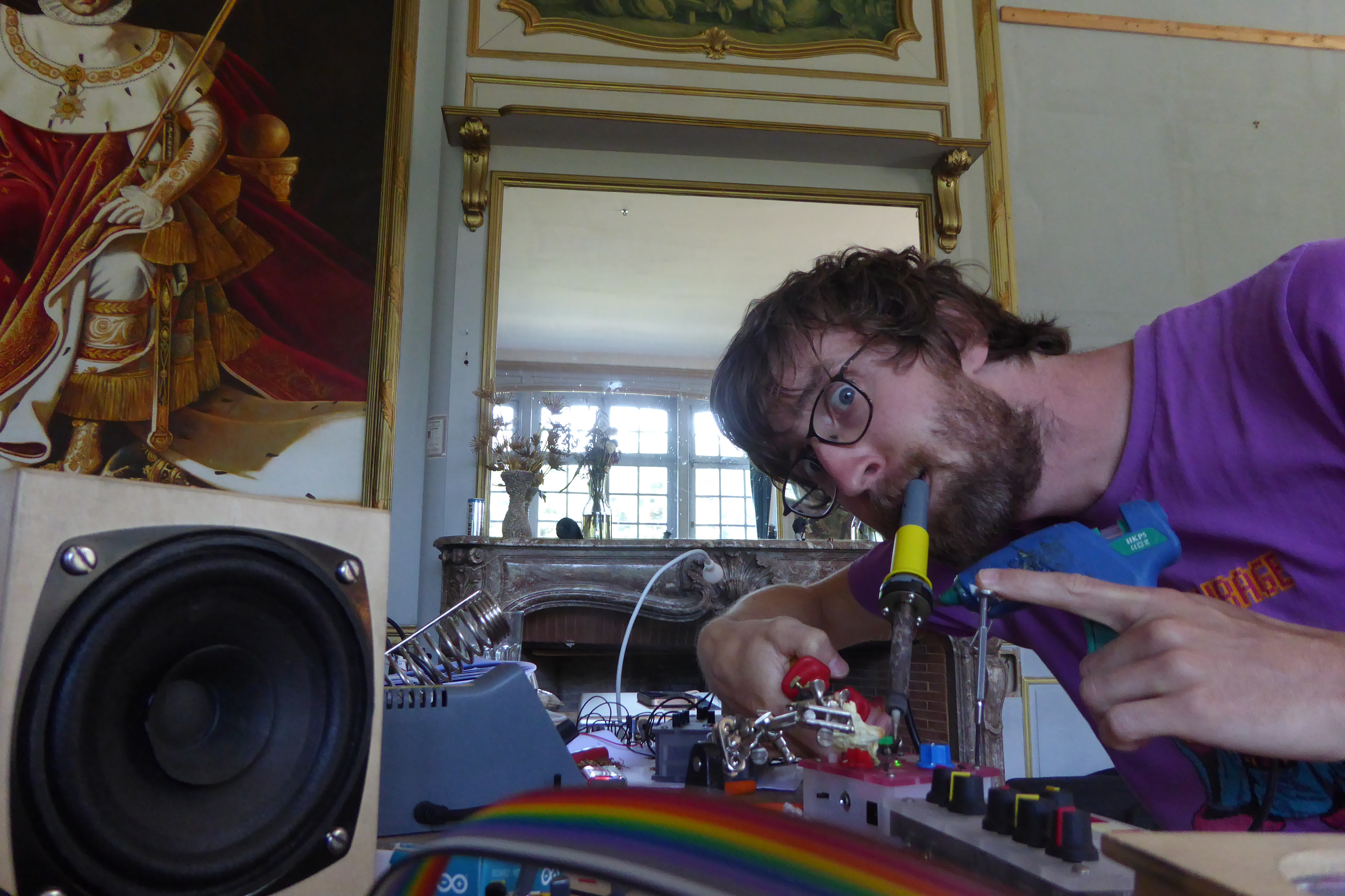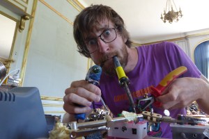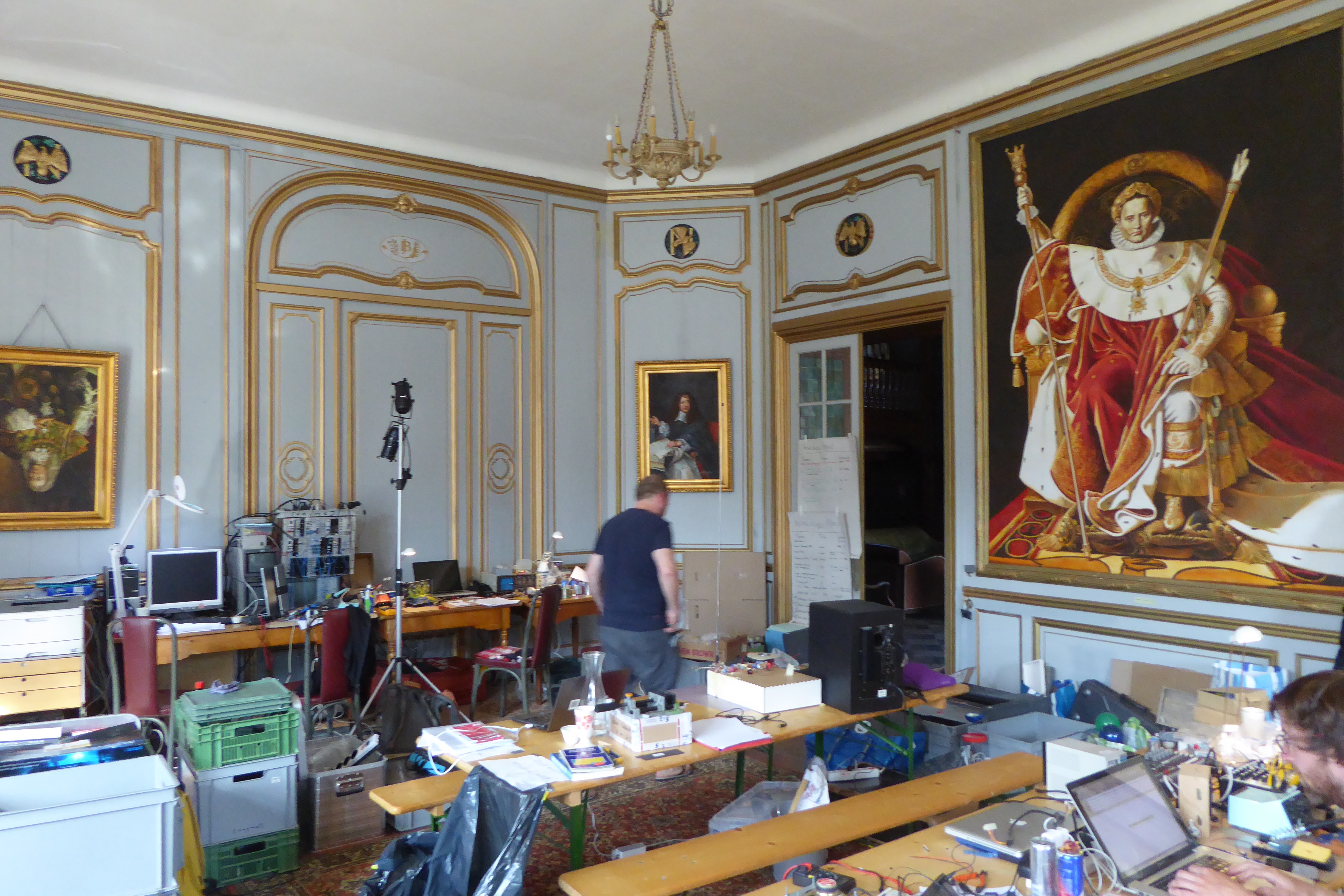 Unsere Wege kreuzen sich im Chateau Fougerette, wo ich als Teil der Schlosscrew Renovationsarbeiten durchführe und Felix in einer Gruppe von Elektromusikern, Videokünstlern, Ingenieuren, Wissenschaftlern und anderen Interessierten eine Woche lang Knowhow austauscht – eine für mich höchst interessante und zugleich seltsame Welt. In so einem Fall ist es am besten, man kommt ins Gespräch und lässt sich diese Welt genauer erklären. Die Gruppe hat sich im Ballsaal unter den grossen barocken Bildern und Spiegeln eingenistet. Der Raum ist vollgestopft mit Werkzeug, Computern, Kabeln, Boxen und allerlei Krimskrams. Mich wundert, wie man in diesem Chaos überhaupt noch seine sieben Sachen findet. Felix nimmt sich zwischen den Workshops Zeit für ein paar neugierige Fragen…