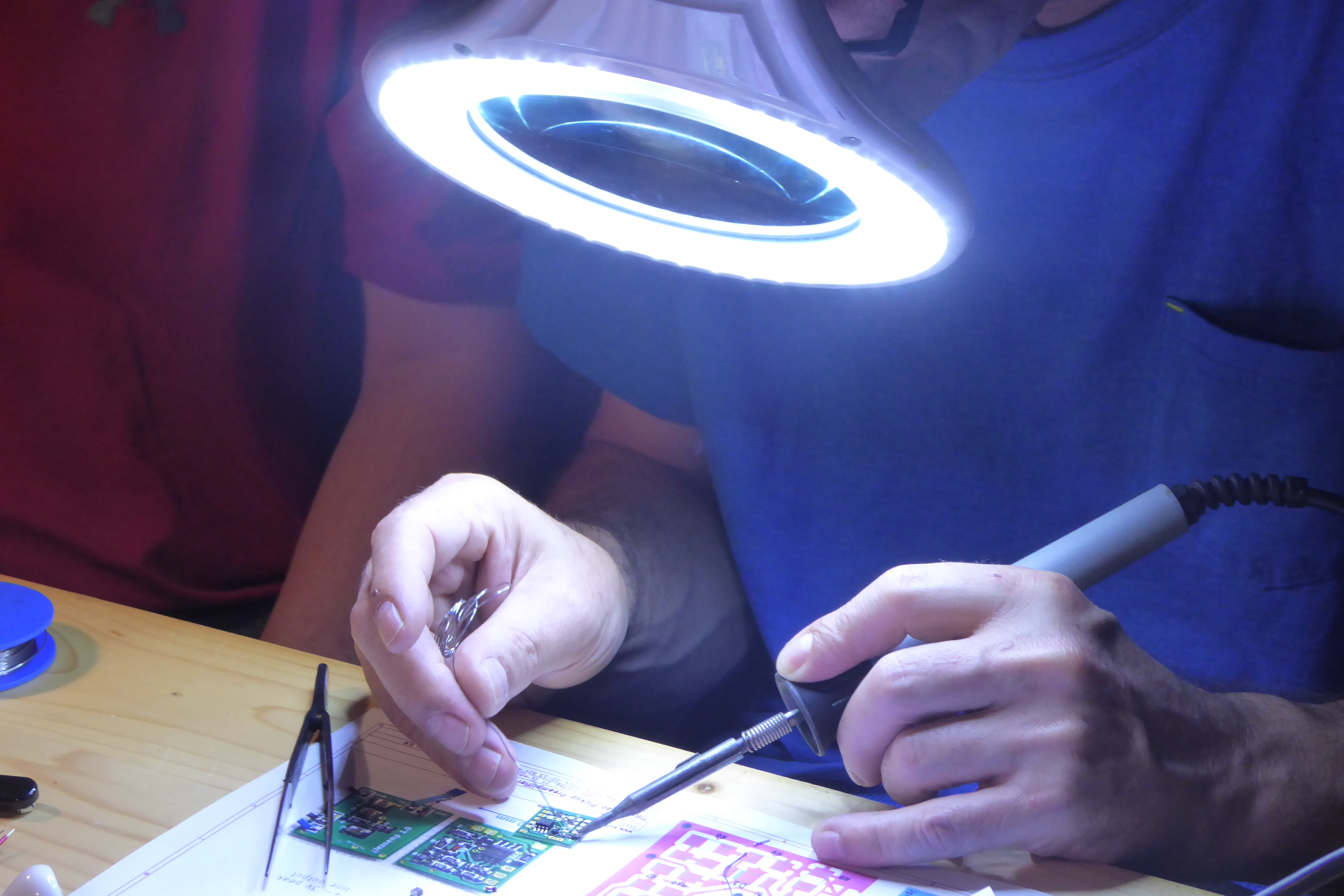 Es handelt sich um kleinste elektronische Bauteile mit bestimmten Funktionen. Alle Geräte, die wir bedienen – zum Beispiel Laptop, Smartphone, Beamer, Taschenlampe – enthalten solche Bauteile. In Workshops nehmen wir solche Alltagsgegenstände auseinander, schauen sie genau an, erklären sie den Teilnehmern und bauen etwas Neues daraus. Wir machen aber auch Schmuckworkshops mit diesen Bauteilen. Oder wenn ein Gerät einen Motor enthält, kann man einen kleinen Roboter oder ein Musikinstrument daraus bauen.