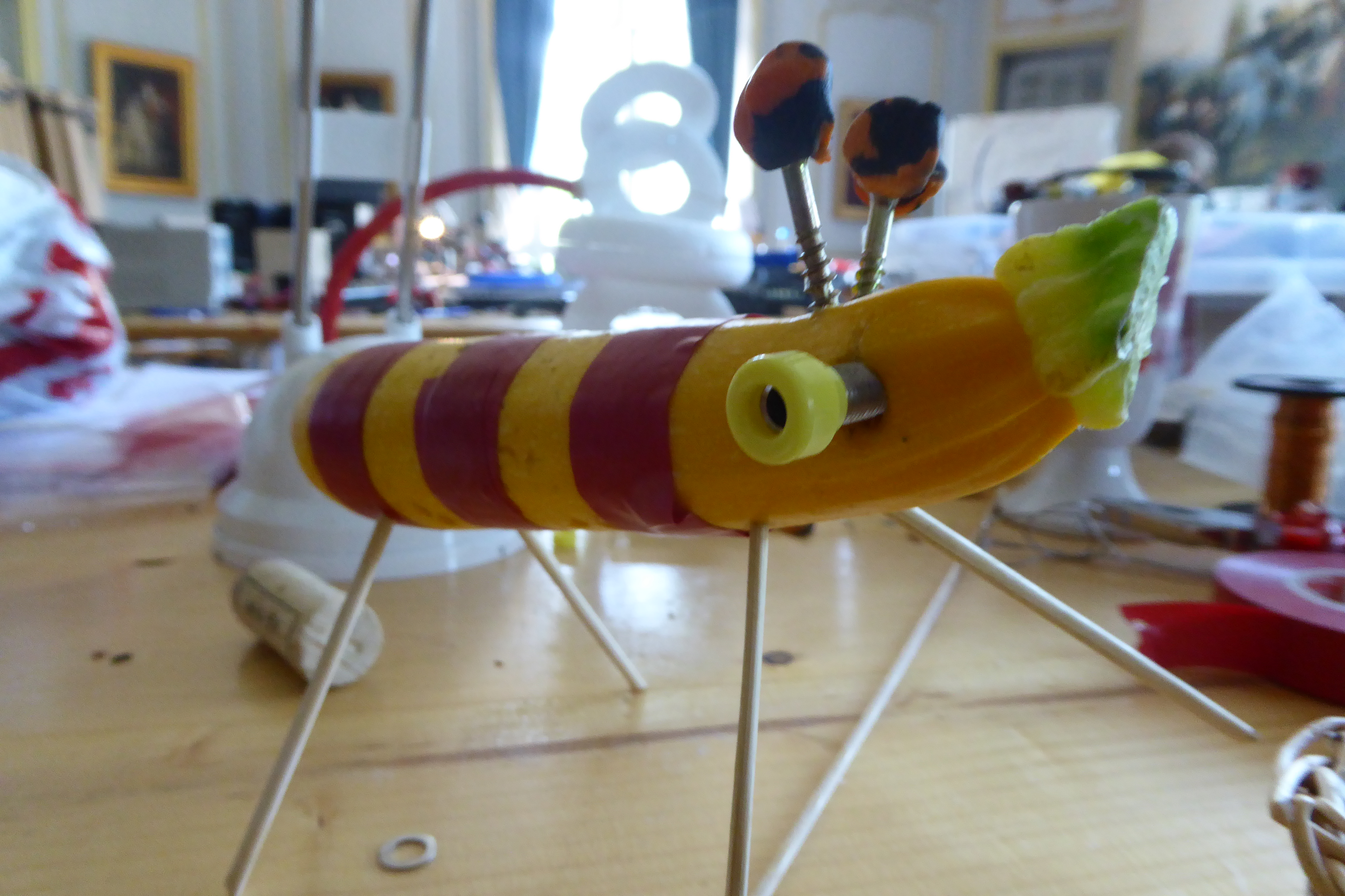 Ich arbeite in einer Riesenhalle am Bahnhof in Luzern, eine Baracke, die ich mit anderen Künstlern zusammen nutze. Im Winter ist es dort saukalt. 50 Prozent der Zeit sieht es aufgeräumt aus und die anderen 50 Prozent liegen Sachen aus den Workshops herum. Wir haben viel Werkzeug, Sägen, Lötkolben, Kabel, bis hin zu Flaschen, Kartoffel- und Computerschips. Es hat freilaufende Mäuse und manchmal liegen Knochen von Luco herum, dem Hund einer Künstlerin. Und ja, auch vergammelte Essenreste findet man bei uns.