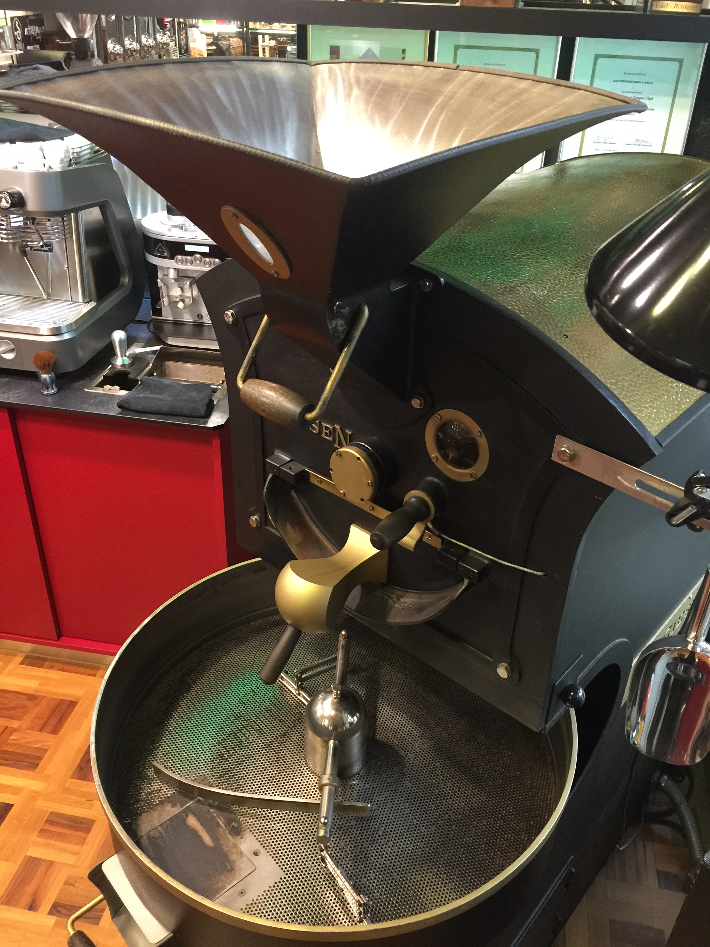 Wenig später stiessen sie im Internet auf die Firma Giesen an der deutsch-holländischen Grenze, die Kaffeeröstmaschinen produziert. An einem stürmischen Februarmorgen flogen sie nach Düsseldorf, um diese Geräte zu begutachten. Danach war klar, dass sie eine Röstmaschine kaufen würden, ohne jedoch zu wissen, wo sie dieses 400 kg schwere Gerät hinstellen könnten. Ihr Plan, eine eigene kleine Kaffeerösterei zu eröffnen, stiess auf grosse Skepsis: „Du bist aber mutig“, hiess es von verschiedenen Seiten, oder „das kannst du vergessen, in Zeiten in denen alle Kapselkaffee trinken!“