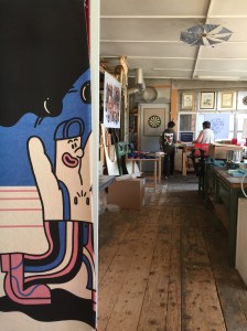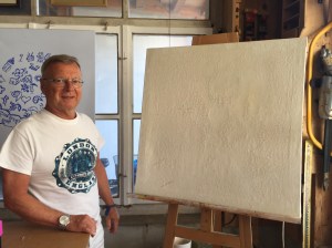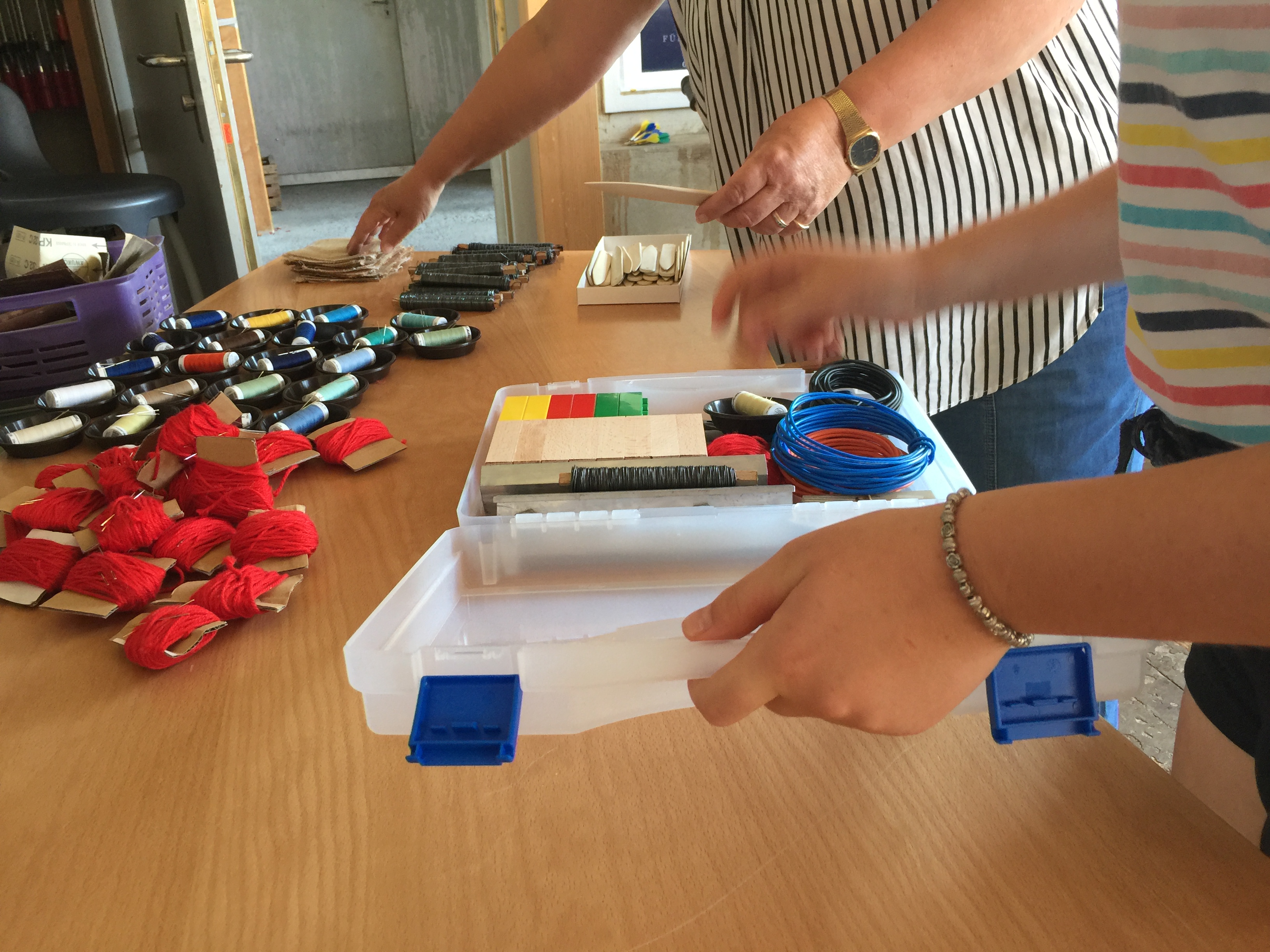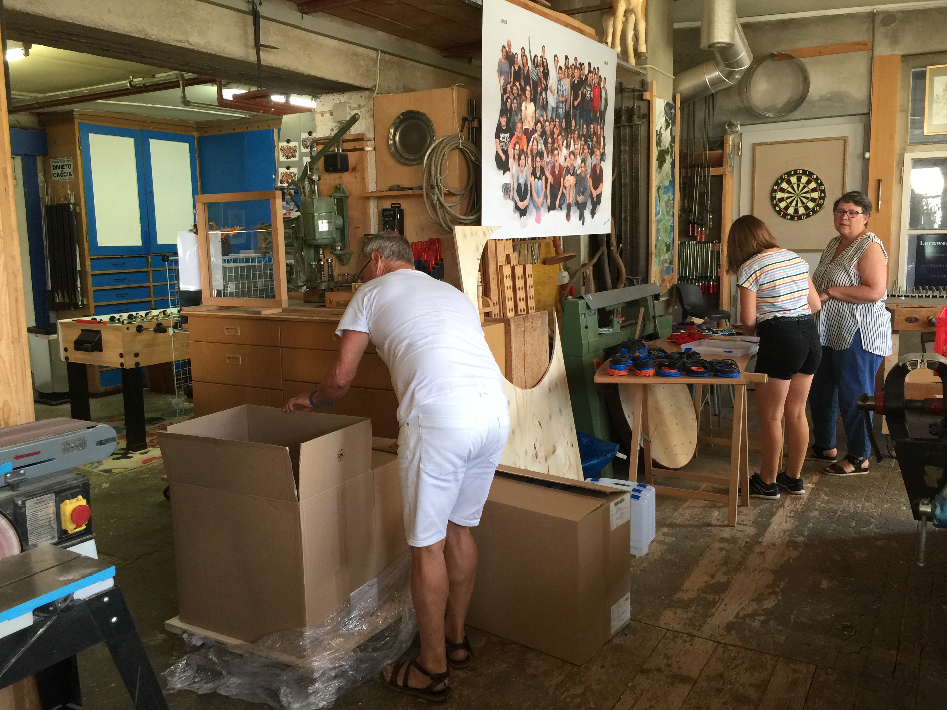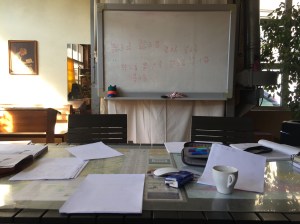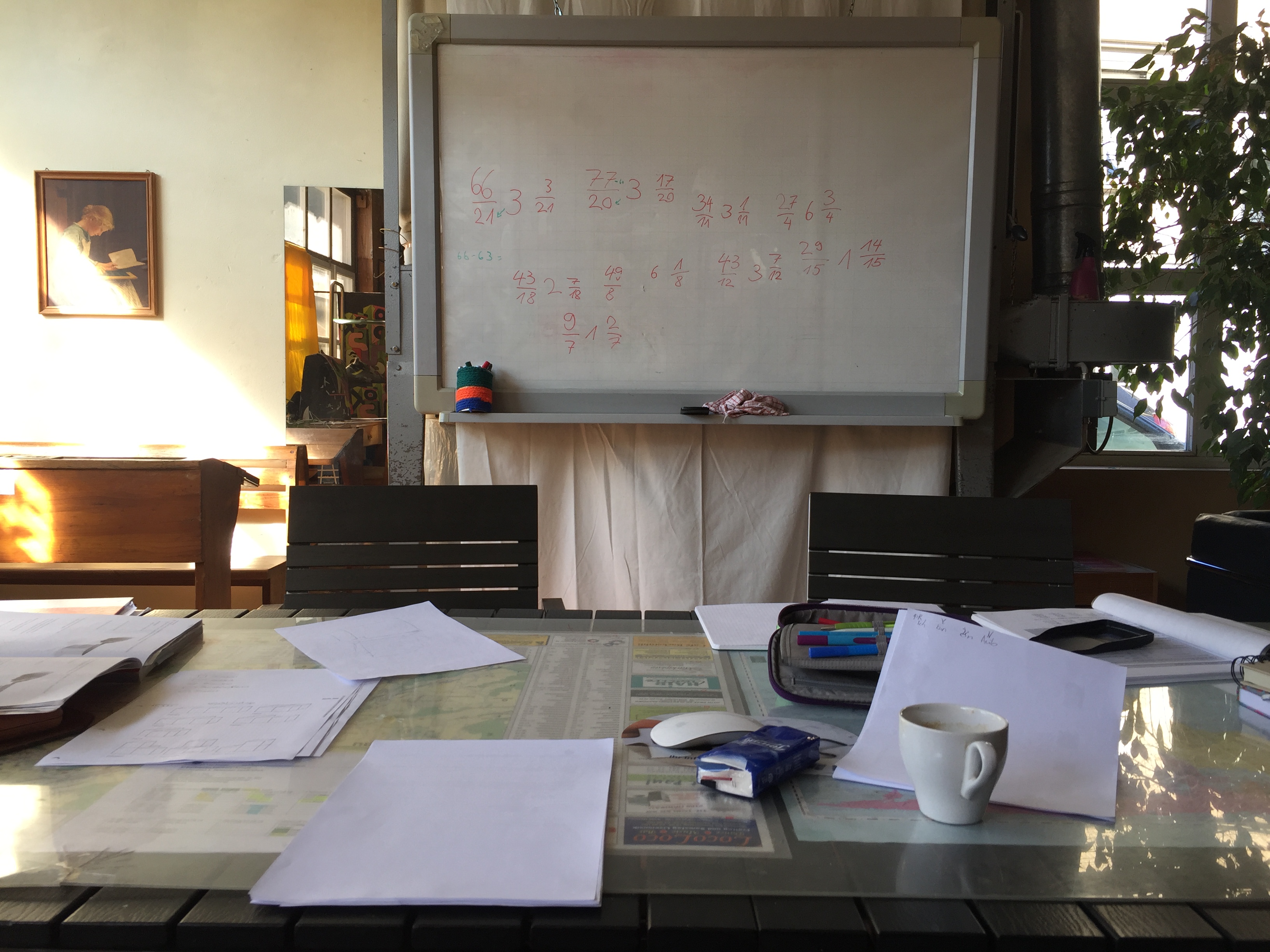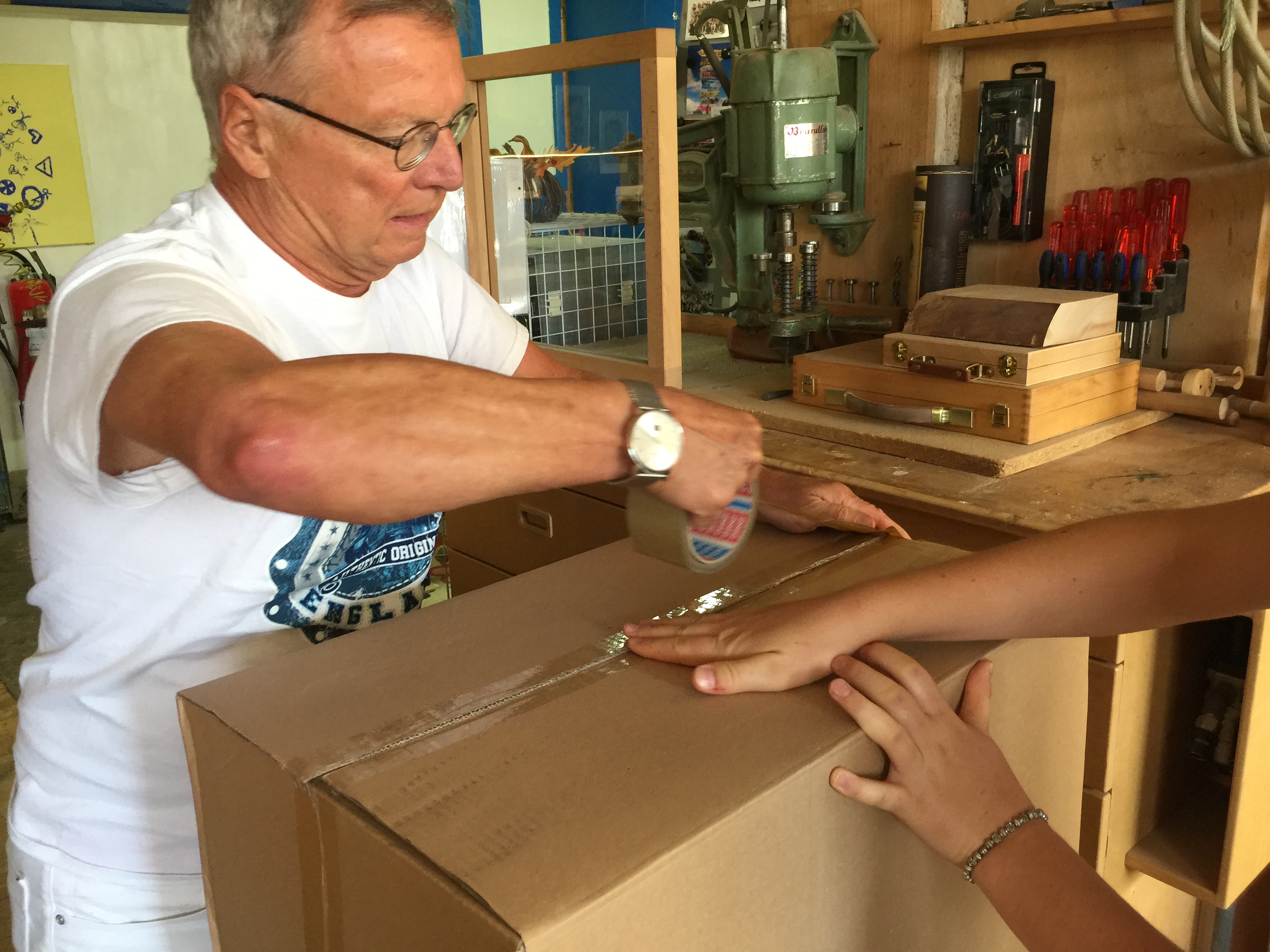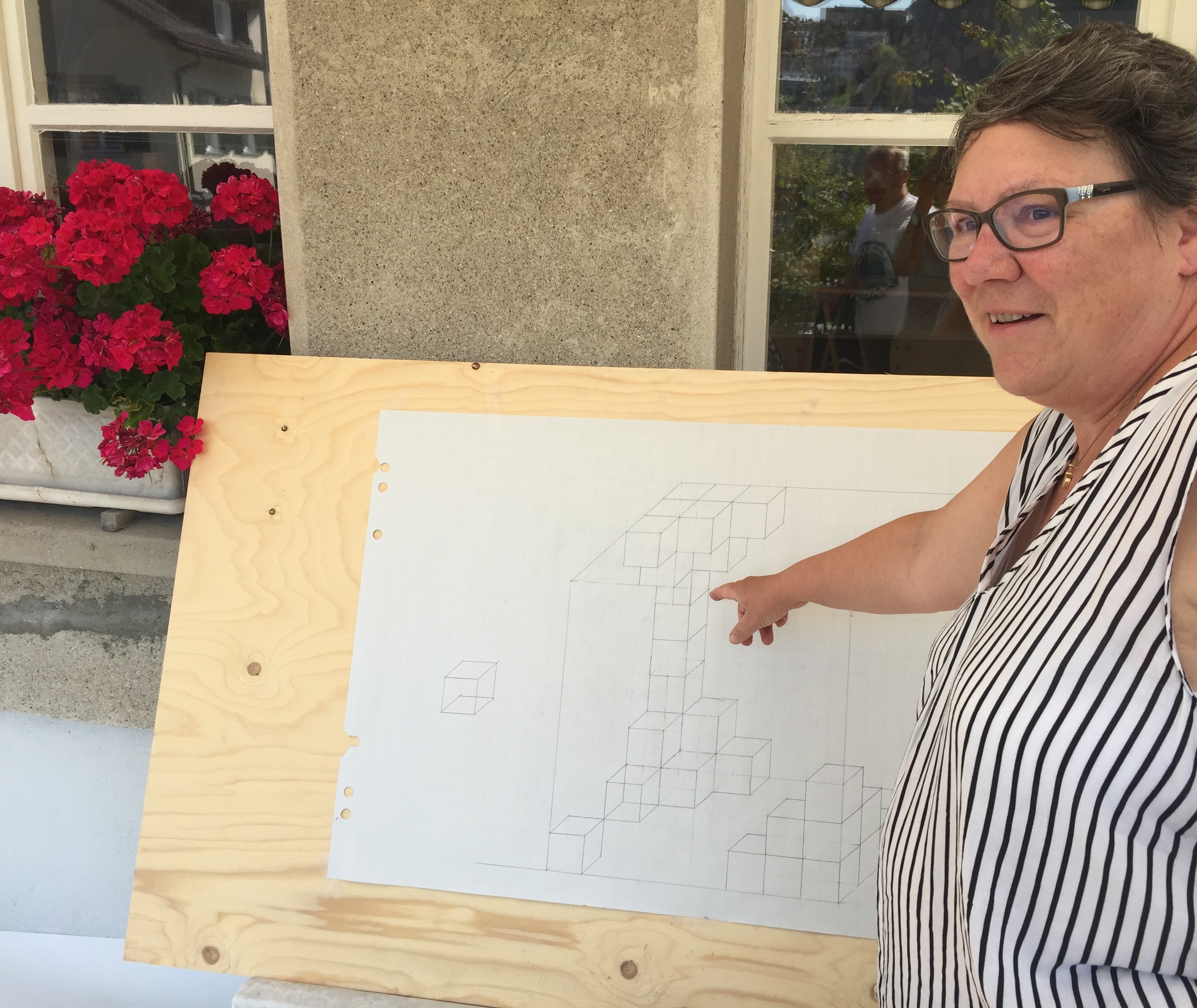 Luzi empfängt mich – getreu seinem Namen – mit einem strahlenden Lächeln. Er bespricht gerade eine komplizierte Aufgabe mit einem Schüler. Dieser sollte eine dreidimensionale Würfeldarstellung auf ein grossformatiges Blatt übertragen. Luzis Frau Monika stösst dazu und der Junge flüstert mit hoch gestrecktem Zeigefinger: „Sie ist sehr streng!“ Dabei lächelt er und ich merke, dass er ihre Strenge durchaus schätzt. Als die Aufgabenstellung geklärt ist, verschwindet der Junge auf die Terrasse, wo ein grosses Brett mit einem karierten Blatt auf ihn wartet. Luzi muss noch ein paar Details mit seiner Frau besprechen, die gerade mit einer Schülerin „Joboxes“ bestückt und verpackt – eine Auftragsarbeit.