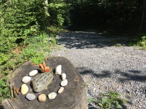 Zuerst waren es nur Worte, die ich auf Steine schrieb, später kamen Verzierungen dazu. Seit einigen Jahren setze ich meine kleinen Steinwerke nach dem Beschriften wieder aus: im Wald, an Stränden, auf Wanderwegen oder im eigenen Garten. Damit sie noch besser zur Geltung kommen, habe ich vor kurzem begonnen, kleine „Altäre“ aus herumliegenden Naturmaterialien für diese Steine zu bauen. Besonders geeignet sind alte, überwachsene Baumstrünke.