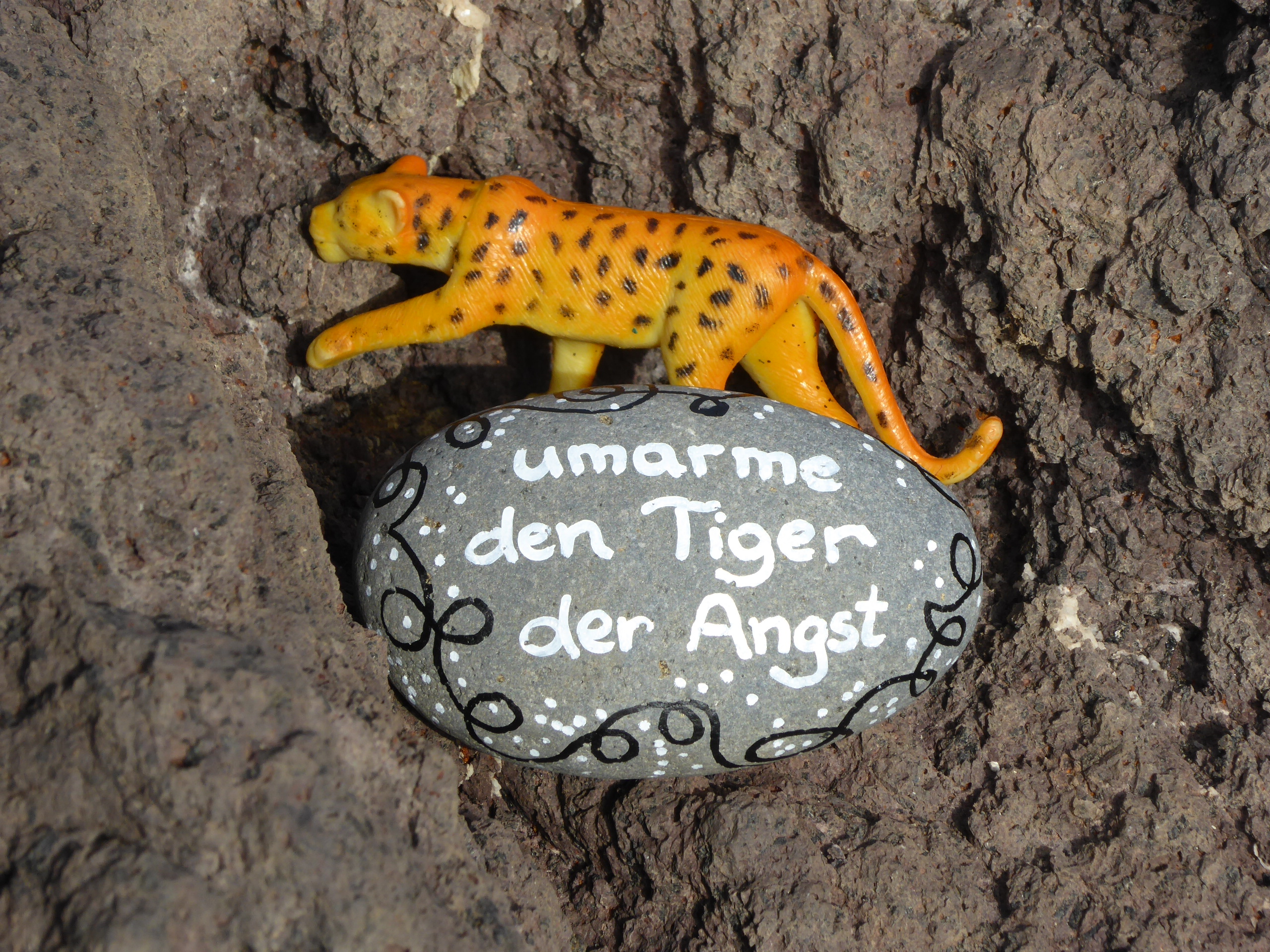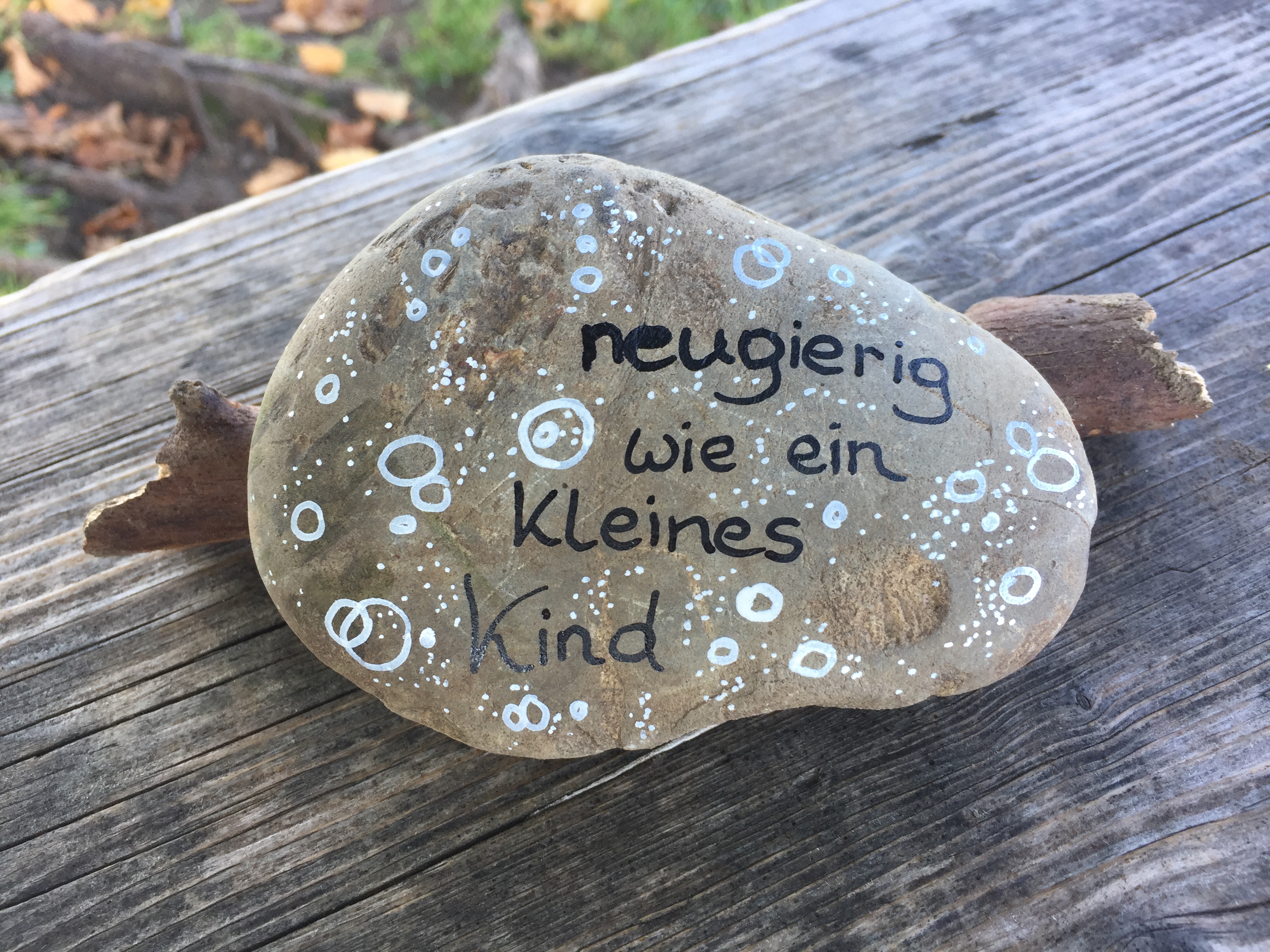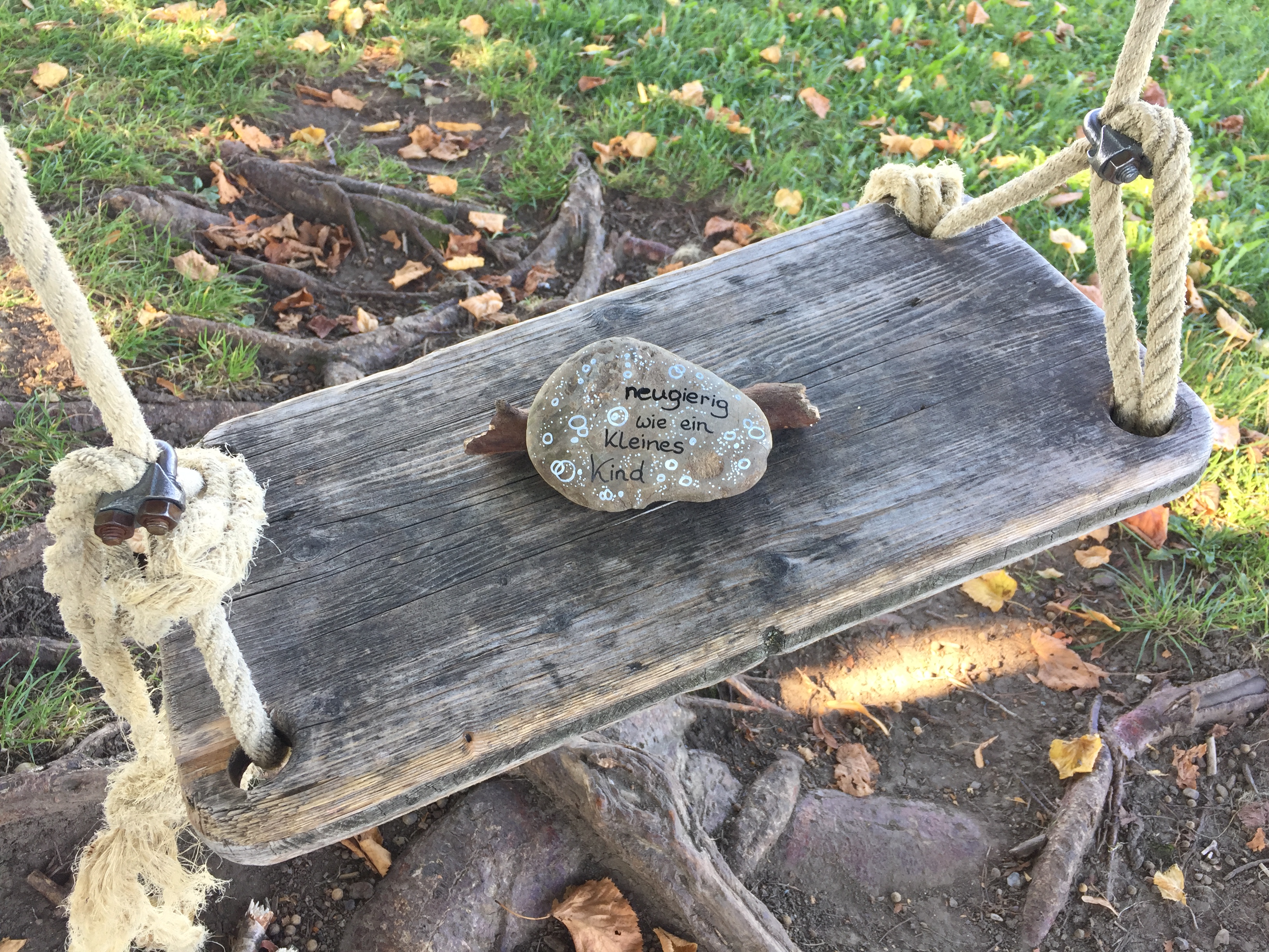Das läuft alles sehr spontan und intuitiv ab. Ich lese Steine beim Wandern auf, horte sie in meinem Rucksack und setze mich an einem stimmigen Platz hin, wo ich sie beschrifte. Oder aber ich entdecke einen passenden Ort für einen bereits beschrifteten Stein, den ich im Rucksack verstaut habe, und bringe Ort und Stein zusammen. Heute z.B. schrieb ich unbewusst folgenden Gedanken auf einen Stein: „neugierig wie ein Kind“. Erst danach wurde mir richtig bewusst, dass ich neben einer Schaukel sass und ich den Stein ja eigentlich auf die Sitzfläche legen könnte 🙂 Dieses Vorgehen fördert meine Offenheit und mein Vertrauen, dass es am Ende super passt (zumindest für mein Empfinden).